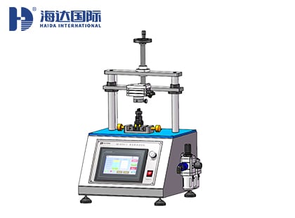 將樣品固定于本機(jī)夾具上(帶電測試樣品需要鎖緊快速插頭),扭緊螺桿把手使樣品固定。旋轉(zhuǎn)氣缸則在調(diào)好適當(dāng)高度情況下,往復(fù)旋轉(zhuǎn)按鈕,直到樣品損壞,記錄點(diǎn)動(dòng)次數(shù)。